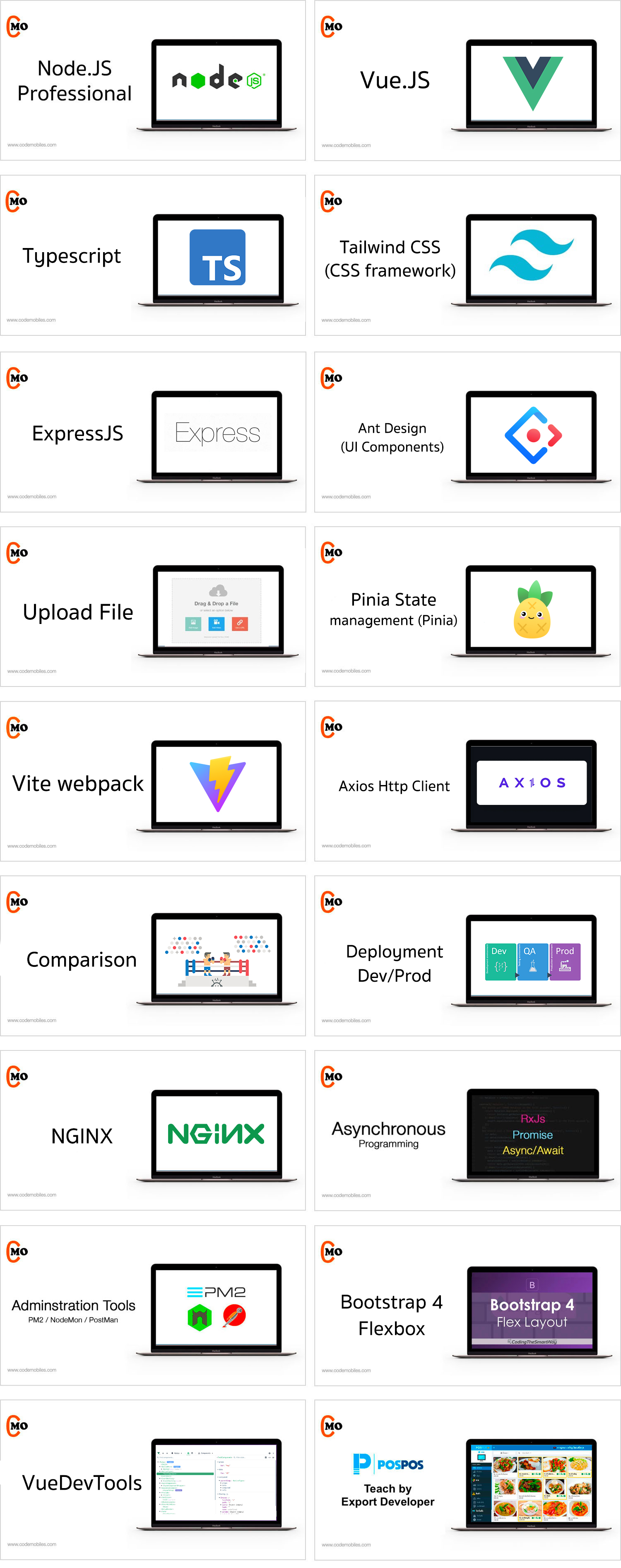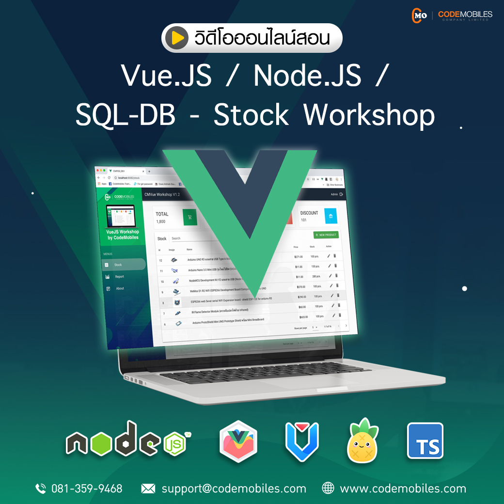 ในหลักสูตรจะมีการสอน Vuetify (Material Components), VueX (State Managment), Node.JS, ORM-Database ที่สามารถเชื่อมต่อกับ MySQL, SQLServer ได้ ในหลักสูตรนักเรียนจะได้เรียนฝึกหัดเขียนโค้ดจริง ไม่ใช่แค่ Concept ผ่าน workshop ระบบคลังสินค้าที่มีระบบ Security อย่าง Login, Register ที่ Secure เข้ามาเกี่ยวข้องด้วย